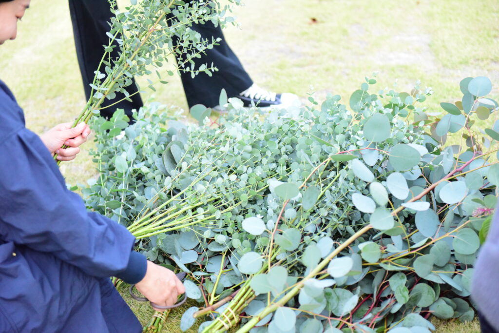 今年の開成マルシェも残すところあと2回となりました。次回は来週11/22(土)です。今回は、開成マルシェ3回目のご出店となりますユーカリ生産者の渡辺さん。アロマエッセンスでも人気の高い「ユーカリ」を富岡町で栽培されています。香りがよく長持ちするユーカリでこれからのクリスマスシーズンにぴったりなリースなどの花材にも最適。開成マルシェに渡辺さんがいらっしゃるとなれば、事務局スタッフもごぞって、購入させていただいています。