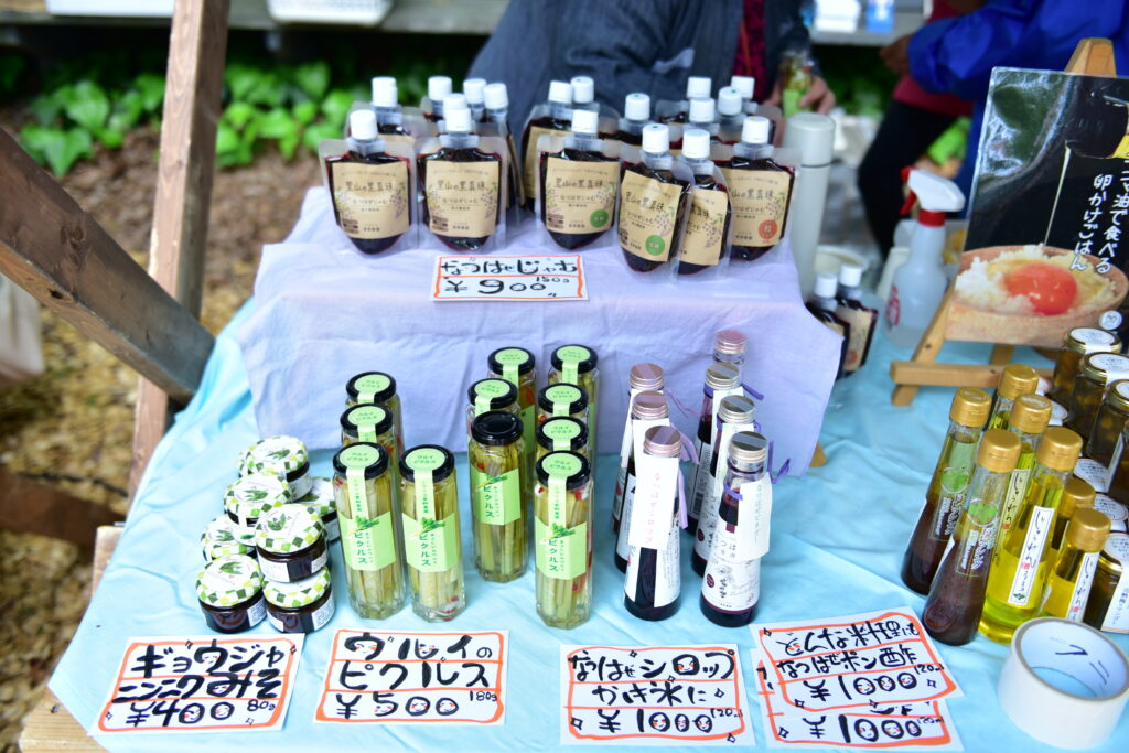 マルシェに並ぶ「ウルイのピクルス」「ギョウジャニンニクみそ」「なつはぜシロップ」「なつはぜポン酢」などクニさんが商品化した品々